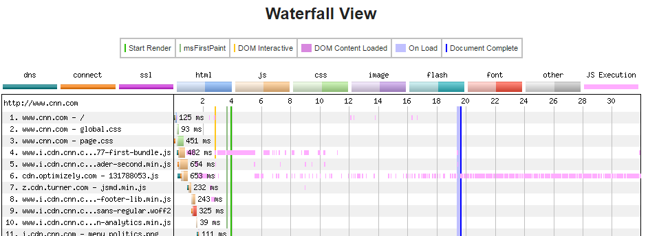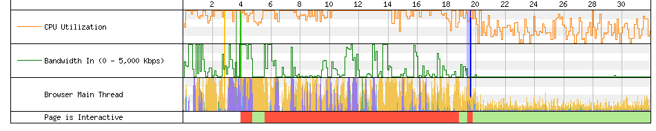 When you scroll down to the bottom of the waterfall graph, you can see CPU Utilization, Bandwidth and browser thread usage. There is also a “Page is Interactive” indicator, which shows that the page became interactive at 2.783 seconds – before anything was even painted to the screen. The page became interactive again at ~4.5 seconds, and then due to JavaScript execution the page was no longer interactive. A short period of time after DOM Complete fired, the page became interactive again.