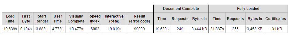 Take a look at the following example WebPageTest measurement. From just the timing metrics we can see that the DOM Interactive fired at 2.783 seconds. The page started to render at 3.883 seconds and then Document Complete occurred at 19.639 seconds. Time to Interactive was considered 19.819 seconds – almost 200ms after DOM Complete.