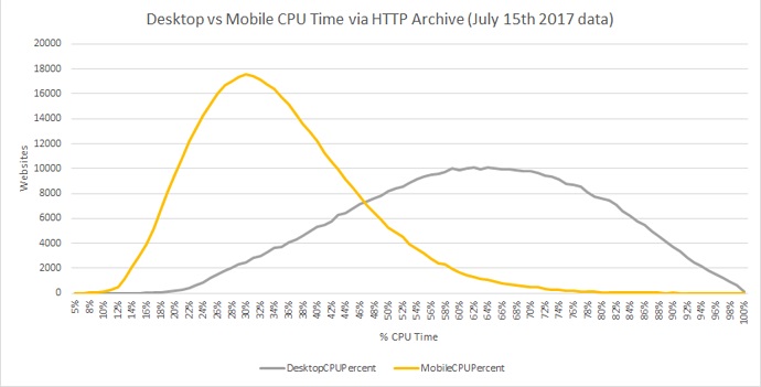 Since we know that the Time to Interactive metric is related to CPU utilization, I thought it would be interesting to take another look at the breakdown of CPU time on Desktop vs Mobile pages. The following query will create histograms that show us this information using the same techniques discussed above: