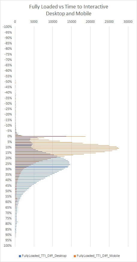 However if you look closely at the Time to Interactive vs Fully Loaded graphs on Desktop and Mobile,you’ll see that the gap is smaller for mobile. I thought this was particularly interesting – and you can see it clearly in the graph below –