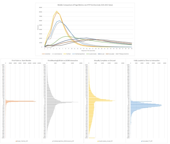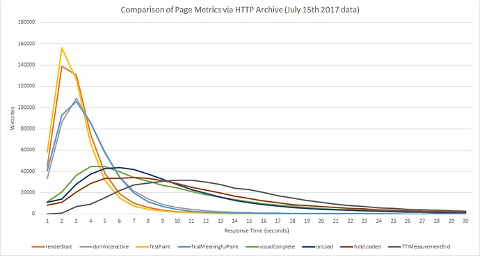 I thought it would be interesting to explore how some of the page metrics we use to analyze web performance compare with each other. In the HTTP Archive “pages” table, metrics such as TTFB, renderStart, VisuallyComplete, onLoad and fullyLoaded are tracked. And recently some of the newer metrics such as Time to Interactive, First Meaningful Paint, First Contentful paint, etc exist in the HAR file tables.