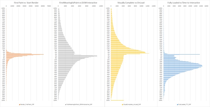 So now we have a few observations – but keep in mind that we are comparing histograms to each other and not individual sites’ performance. This allows us to observe some interesting patterns and it is tempting to draw conclusions, but it is important to validate the assumptions. For example, how likely is it that a particular site is going to have a First Paint time that tracks very close to Render Start, a Visually Complete time close to onLoad, a Time To Interactive that is etc?