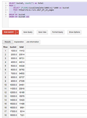 FROM (SELECT (FLOOR(visualComplete/1000)+1) as bucket FROM httparchive.runs.2017_07_15_pages)