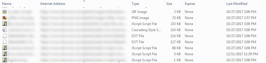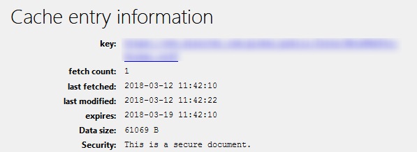 With Internet Explorer 11, we can look at the Temporary Internet Files to see how the browser handles heuristic freshness. This is similar to the about:cache investigation we did for Firefox, but it’s the only visibility we have to work with. To do this, clear your browser cache, then open a page where objects are being heuristically cached. Then view the files in C:\Users\<username>\AppData\Local\Microsoft\Windows\Temporary Internet Files. The screenshot below shows that there is no expiration for the resources cached, although it’s not clear whether a heuristic is used.