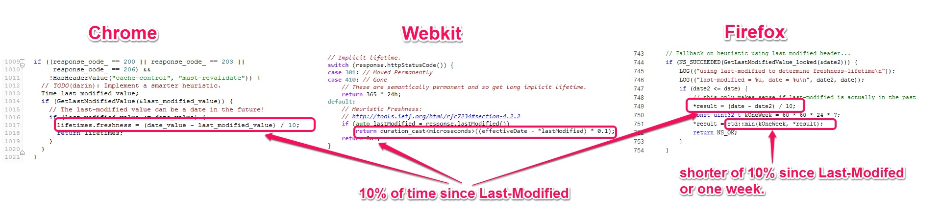 Since Firefox, Chrome and WebKit are open source, we can actually dig into the code and see how the spec is implemented. In the Chromium source as well as the Webkit source, we can see that the lifetimes.freshness variable is set to 10% of the time since the object was last modified (provided that a Last-Modified header was returned). The 10% since last modified heuristic is the same as the suggestion from the RFC. When we look at the Firefox source code, we can see that the same calculation is used, however Firefox uses the std:min() C++ function to select the less of the 10% calculation or 1 week. This explains why we only saw the resource cached for 7 days in Firefox. It would likely have been cached for 13 or 14 days in Chrome.