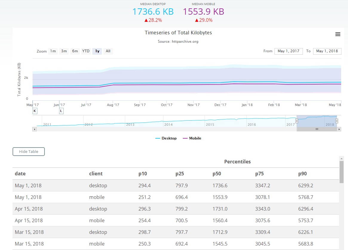Shortly after the 3MB average page weight milestone was reached last summer, I did some analysis to try and understand the sudden jump in page weight. It turns out that the largest 5% of pages were influencing the average, which is a perfect example of averages misleading us.