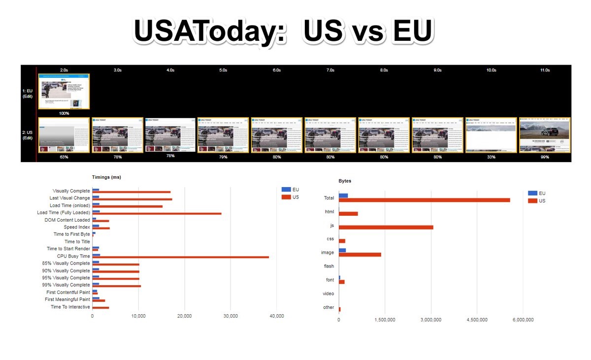 I recently did some research to show that sites with more 3rd party content are more likely to be slower. And then a few days later USAToday showed us an extreme example by publishing a GDPR friendly version of their site for EU visitors. The EU version has no 3rd party content, substantially less page weight and is blazing fast compared to the US version.