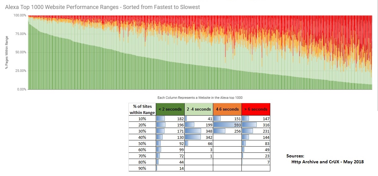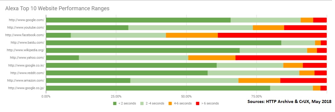 By leveraging CrUX and the HTTP Archive together, we can analyze performance across many websites and look for trends. For example, below you can see how often the Alexa top 10 sites are able to load pages in less than 2 seconds, 2-4 seconds, 4-6 seconds and greater than 6 seconds. It’s easy to glance that this chart and see which sites have a large percentage of slower pages. I wrote a another post about how we can use CrUX data like this to compare yourself to competitors.