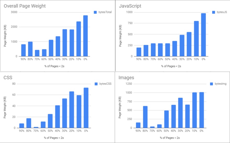 In the top left graph, page weight shows a strong correlation, and the sites with less fast pages tended to have larger page weights. The remaining 3 graphs show how JavaScript, CSS and Images contribute to page weight and performance. Based on these graphs, Images and JavaScript are the most significant contributors to the page weights that affect load time. And for some slow sites, the amount of compressed JavaScript actually exceeds the number of image bytes!