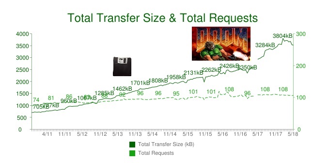 Over the years it has been fun to track website page weight by comparing it to milestones such as the size of a floppy disk (1.44MB), the size of the original install size of DOOM (2.39MB) and when it hit 3MB last summer.