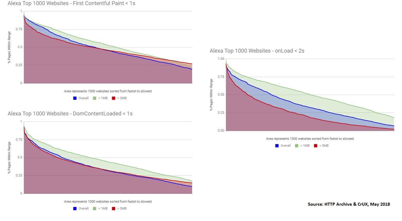 - The fact that there are still some fast >3MB pages and slow <1MB pages proves that page weight isn’t everything, and it is possible to optimize rich experiences for performance.