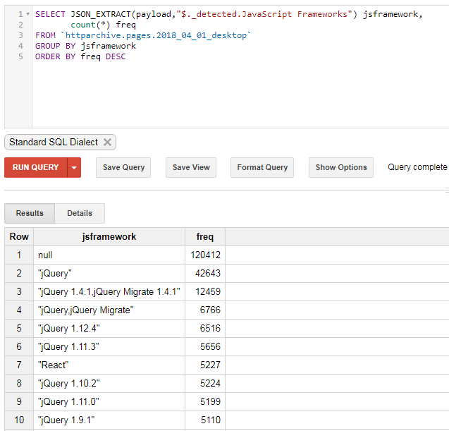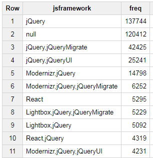 Below is a query that simply extracts the “JavaScript Frameworks” variable from the Wappalyzer results and summarizes by the number of sites using them:
