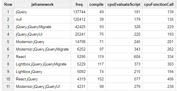 And now we can see not only the counts of websites using each Framework - but also the median CPU times.