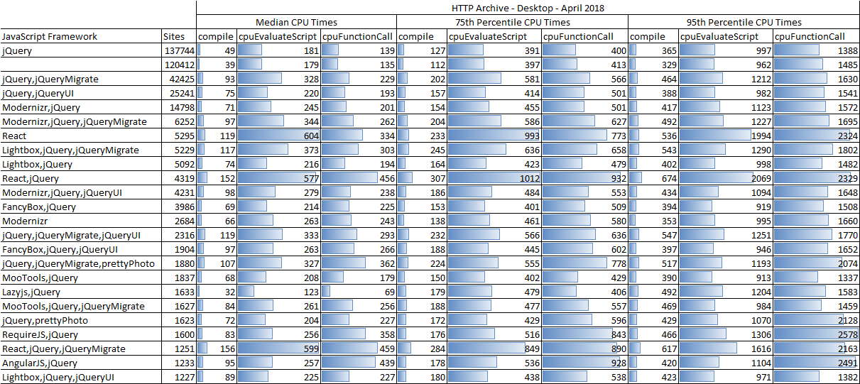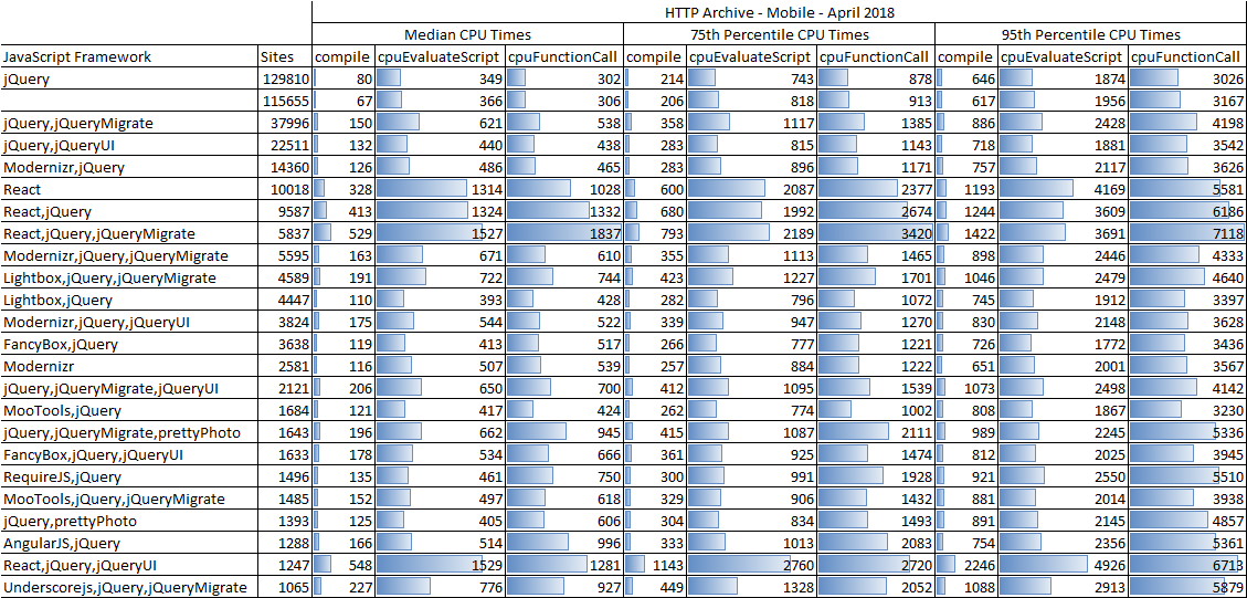 - The wide range between the median and 75th percentile CPU timings is very interesting, and makes me wonder if examples of how to use these frameworks in more (or less) performant ways are buried in the details (hint: this can also be queried via the HTTP Archive by expanding on this example more )